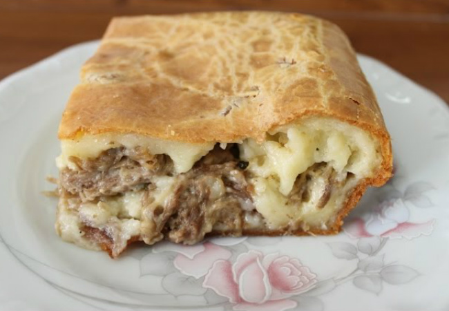 Essa receita de bolo de pão de queijo é recheada com uma carne previamente cozida e temperada, já desfiada.