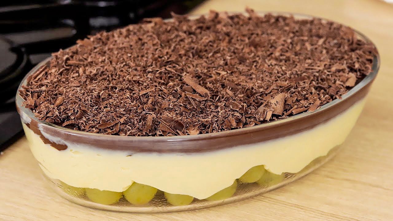 A versão com uvas verdes também fica maravilhosa. Essa receita tem uma montagem um pouc diferente, mas a combinação de cremes é bem parecida. Por baixo vai uma camada de uvas frescas, depois vai o creme de leite condensado e finaliza com a ganache de chocolate.