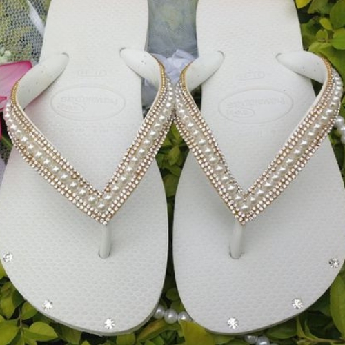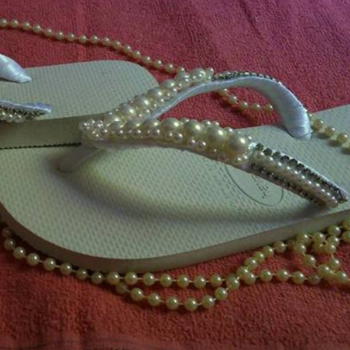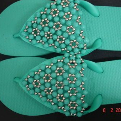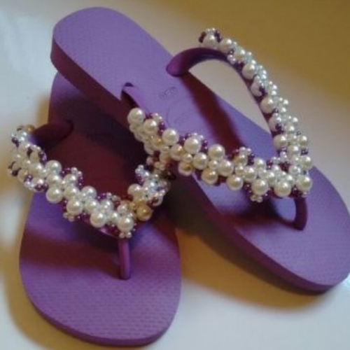 As miçangas já são ideais para aqueles chinelos praianos, mais leves e descolados. Você pode usar uma infinidade de cores e modelos de miçangas e também irá costurá-las as tiras ou nas laterais do chinelos, usando a mesma técnica do bordado com pérolas ou pedrarias.