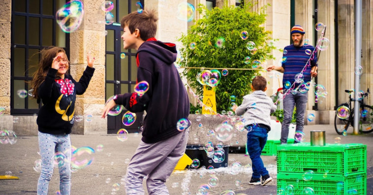As crianças adoram brincadeira com água e com espuma, então as bolhas de sabão não poderiam ficar de fora da lista. Para brincar, só precisa colocar um pouco de água com detergente de louça em um copo pequeno e misturar com um canudinho. Depois, deve molhar uma das pontas do canudo na água e soprar a outra ponta para que saiam as bolhas. Rende horas de diversão.