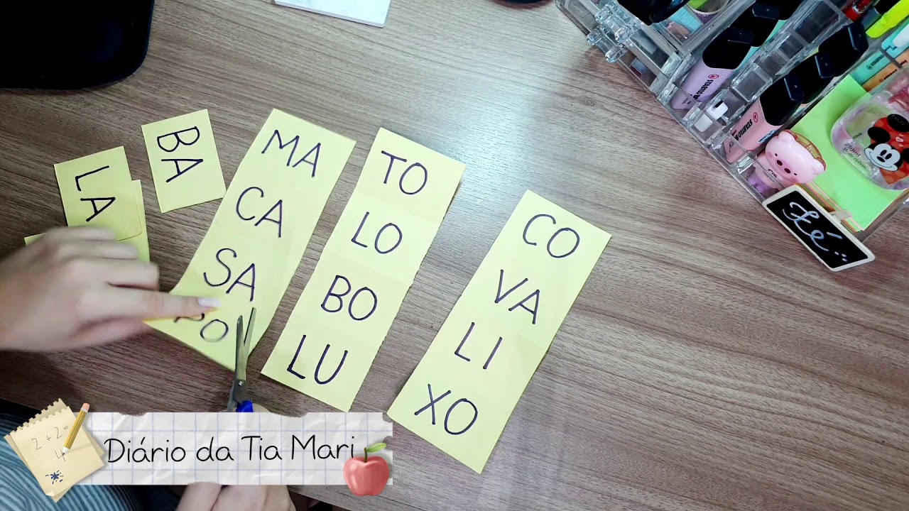 Para esse brinquedo você só vai precisar de papel, canetão e régua ou tesoura. Em cada pedacinho de papel você vai escrever sílabas, e depois a criança vai pegar as sílabas para formar várias palavras. Confira como é simples de fazer: