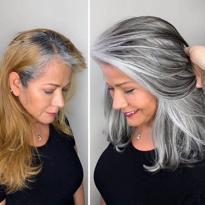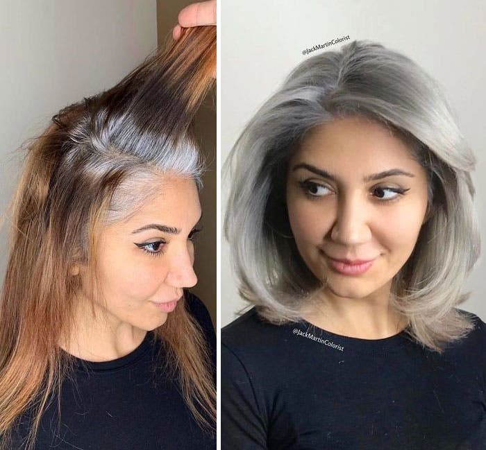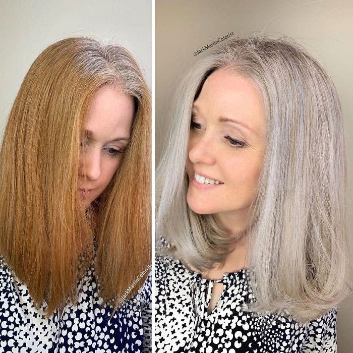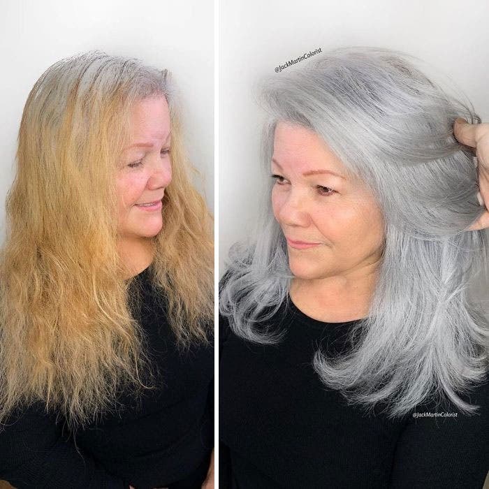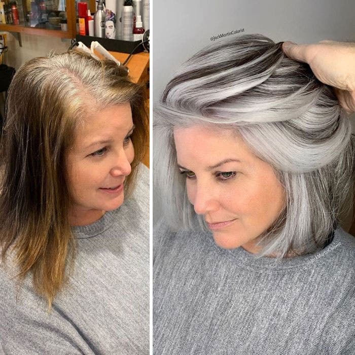 Então, junto com a cliente, Jack decidiu utilizar um tom prateado com nuances mais claras e escuras, o que deixaria a nova cor semelhante à raiz natural, reduzindo a necessidade de ir todo mês ao salão para aplicar mais tintura.