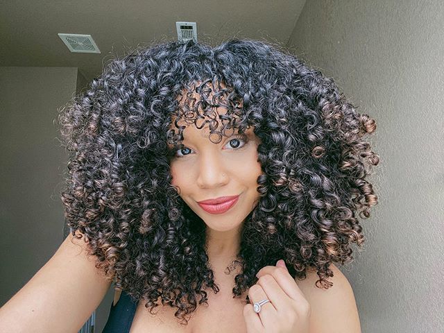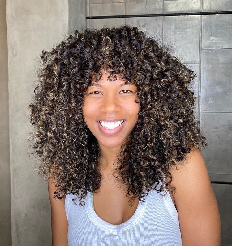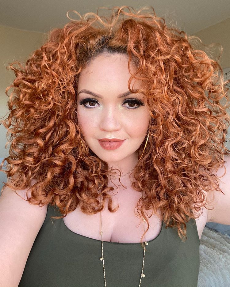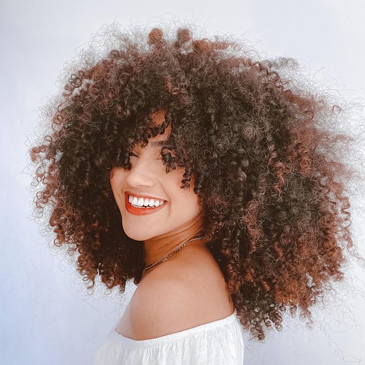 4. Cabelo cacheado médio com cachos acobreados e uma franjinha cheia de charme