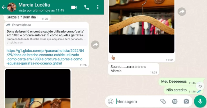 Márcia contou que ficou surpresa quando leu a notícia de que o cabide tinha sido encontrado. Ela recebeu o link da reportagem por uma colega de trabalho. Depois, conseguiu o número de Graziela e entrou em contato.