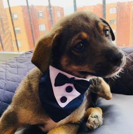 O pessoal do abrigo combinou com a família quando seria o dia em que eles viriam para levar o pequeno para casa. Então, deram um banho nele e o vestiram com um lenço que lembra um smoking para que ele ficasse ainda mais fofo. Uma data especial merecia um traje especial.