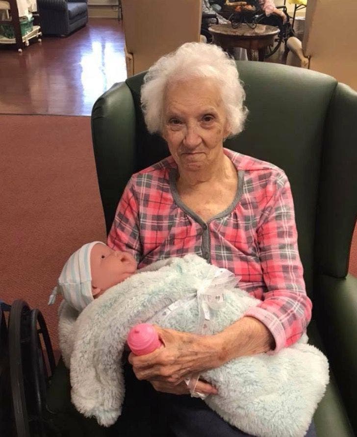 Tudo começou quando a sogra de Sandy, que se chamava Pearl, foi diagnosticada com Alzheimer e foi internada em uma instituição para pessoas com doenças relacionadas. Então, Sandy e o marido presentearam todos os idosos da instituição com bonecas, dessas que se parecem com um bebê de verdade, e cachorrinhos de pelúcia.