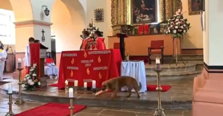 Um cachorro caramelo vai se aproximando do altar sem ser visto pelo padre, “rouba” um pedaço de pão que seria usado na cerimônia e sai de fininho, apesar de estar sendo observado por todos os fiéis.