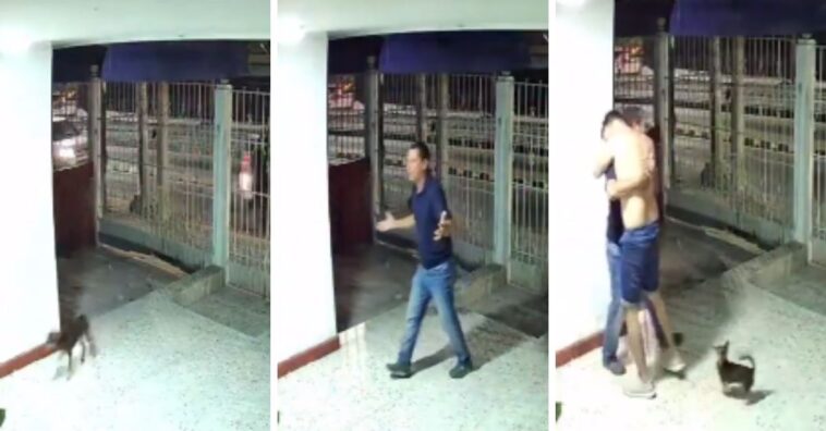 Estavam todos dentro de casa quando o cachorro apareceu na porta e os surpreendeu. A câmera de segurança da residência, que fica virada para o portão, registrou o momento do retorno de Brownie, se espremendo para conseguir passar por baixo do portão.