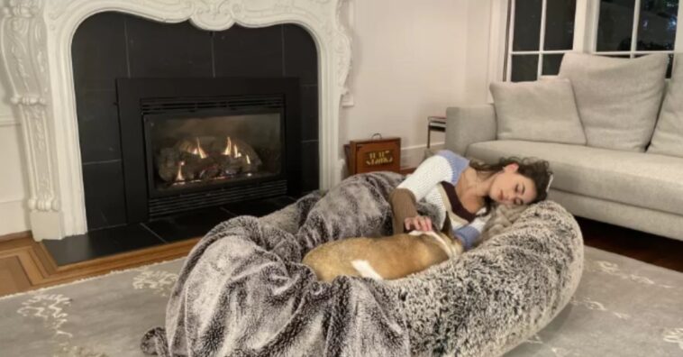 Pensando nessas pessoas, foi criada uma cama para pets que tem um tamanho suficiente para que um humano possa se aninhar com seu animalzinho e tirar um cochilo.