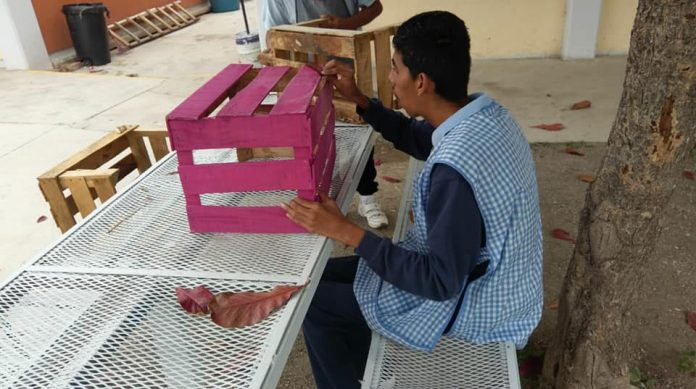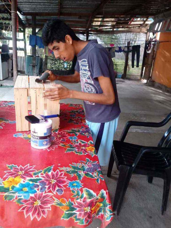 Carmem ajuda Elías confeccionando as almofadas que vão dentro das caminhas, enquanto o garoto confecciona as caixas, fazendo os cortes, o lixamento e a pintura. Inclusive, pintando o nome de cada pet que vai receber uma caminha especial.