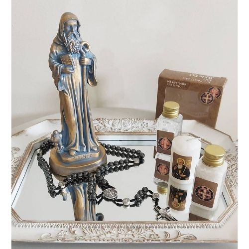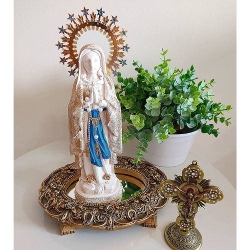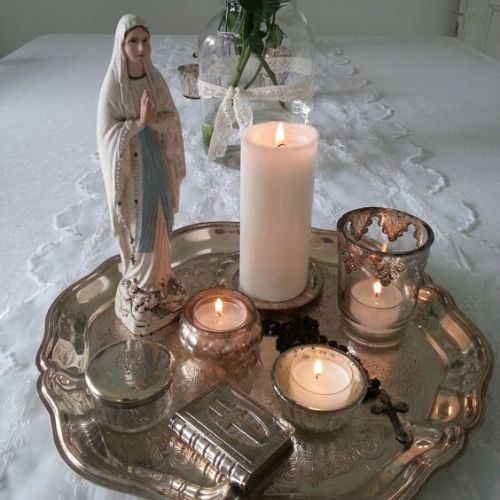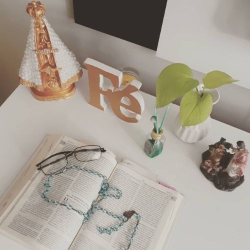 Se não tiver qualquer espaço em casa para montar um altar, ou não puder investir, não tem problema. Você pode pegar uma bandeja bem bonita e colocar sobre ela as imagens e elementos que gosta de ter perto na hora das suas preces. O que está no coração importa mais do que a forma física que você usa para representar a sua fé.
