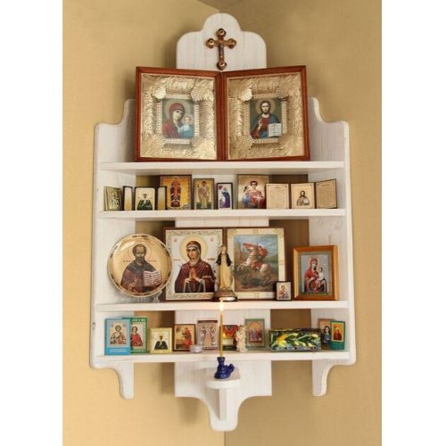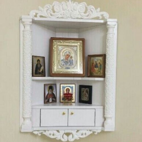 Se tiver apenas um cantinho na parede e quiser montar um altar para as imagens, esse modelo para cantos de parede ocupa quase nada de espaço.