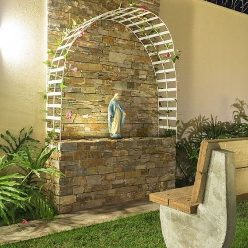 Quer dedicar um espaço maior para as suas imagens de devoção? Pode investir um pouco mais? Essa ideia de criar um altar de pedras com um pergolado de flores é linda. Como nessa imagem, pode colocar um banco na frente para se sentar e orar.