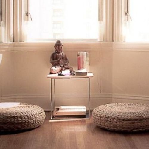 No cantinho mais calmo e silencioso da casa, se possível perto de uma janela, pode montar o seu espaço para meditação apenas usando uma mesinha simples e almofadas, caso tenha o hábito de se sentar no chão para meditar. Simples e muito agradável.