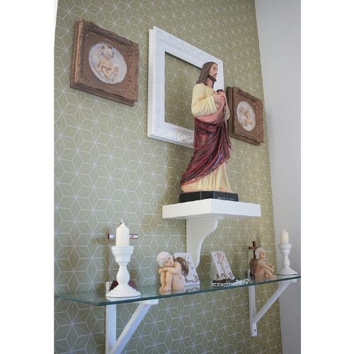 Papel de parede discreto, molduras com imagens de santos e prateleira de vidro com suporte branco fazem uma combinação que harmoniza com diversos estilos de decoração e pode até ser montada no hall de entrada da sua casa para recepcionar seus convidados e a família.