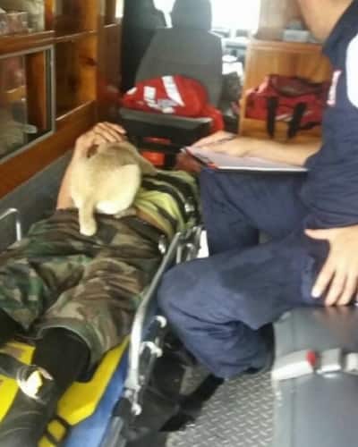 Meu debaixo da chuva que havia começado, o cão não abandonou seu dono até a ambulância chegasse. E mesmo quando os paramédicos estacionaram para socorrer o senhor ferido, o cão entrou junto na ambulância e se deitou no peito do dono.