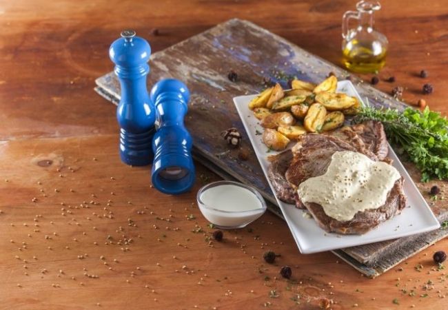 4. Bife ao molho de mostarda com batatas rústicas