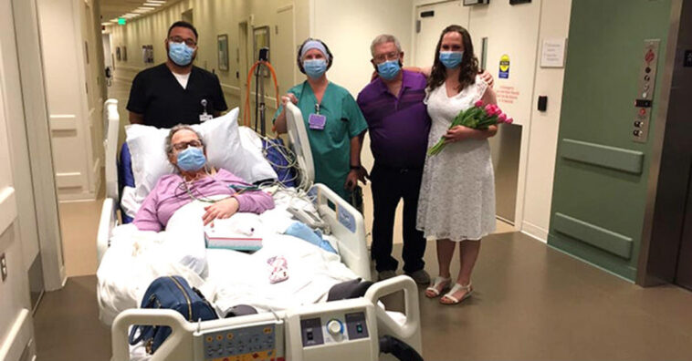 Deixar o hospital não era uma opção. Foi então que a equipe médica teve a ideia de fazer a cerimônia no jardim, com todo o suporte médico necessário. O padre estava presente, assim como os noivos e a equipe. Não foi uma cerimônia como eles tinham planejado, mas certamente foi inesquecível.