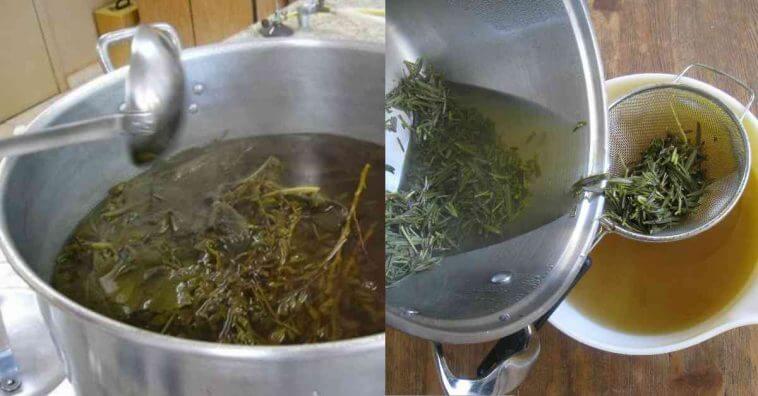 Em uma panela, coloque a água junto da cevada e deixe fervendo durante 40 minutos. Depois, coe a mistura e adicione ao líquido o gengibre, a tanchagem e a cúrcuma. Espere ferver novamente, e quando levantar fervura deixe mais 20 minutos no fogo.