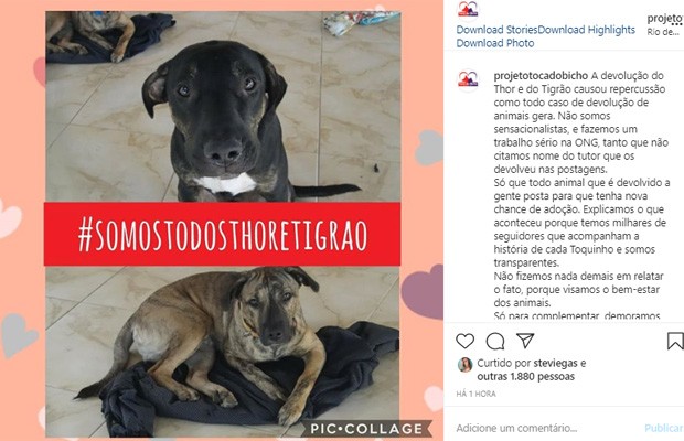 “A devolução do Thor e do Tigrão causou repercussão como todo caso de devolução de animais gera. Não somos sensacionalistas, e fazemos um trabalho sério na ONG, tanto que não citamos nome do tutor que os devolveu nas postagens. Só que todo animal que é devolvido a gente posta para que tenha nova chance de adoção”.