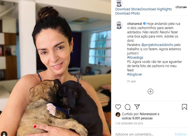 Em dezembro de 2019 a atriz Claudia Ohana publicou em seus Instagram que tinha acabado de adotar dois cães filhotes. Na publicação, ela escreveu: “Hoje andando pela rua vi dois cachorrinhos para serem adotados. Não resisti! Resolvi fazer uma boa ação para mim. Adotei os dois! Parabéns @projetotocadobicho pelo trabalho q vcs fazem. Agora estamos juntos!!!”
