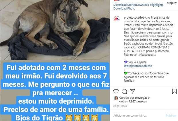 “Precisamos de uma família urgente pra Tigrão e seu irmão! Estão muito deprimidos depois que foram devolvidos. Nao é justo. Eles não pediram para passar por isso. Nos ajudem a achar uma família para esses lindos bebês de porte grande!”