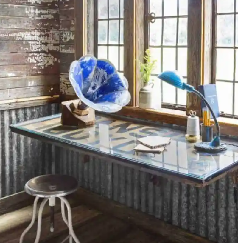 Algumas das velhas janelas e toldos de metal que Amy havia colecionado, finalmente encontraram seu lar na casa de hóspedes do silo.