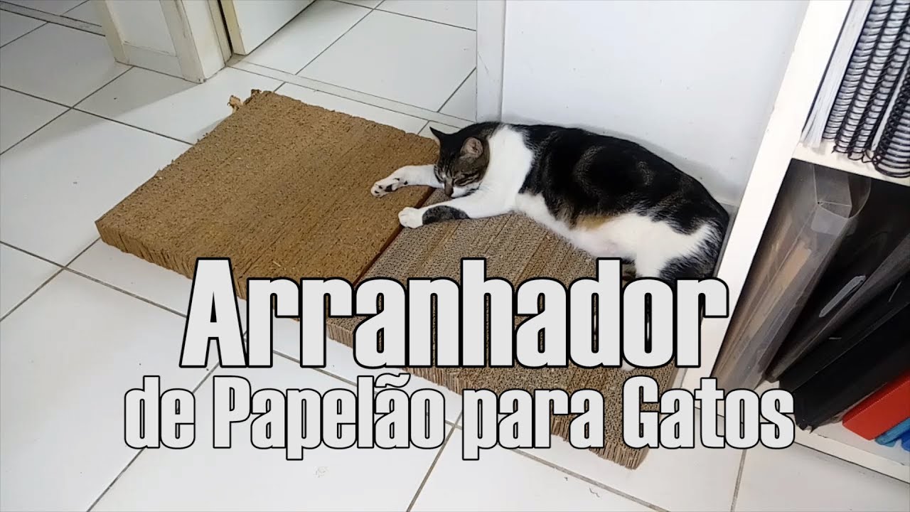 Existe também um modelo fácil de arranhador de piso, que fica como um tapete no chão e é feito só de papelão. Seu gato vai usar para arranhar e também para dormir em cima, pois para ele é confortável. Basicamente você vai cortar muitas tiras de papelão, todas do mesmo tamanho, e depois vai uni-las bem firme, fazendo um tapete. Aprenda o passo a passo e as dicas nesse vídeo do canal Coroa de Pano: