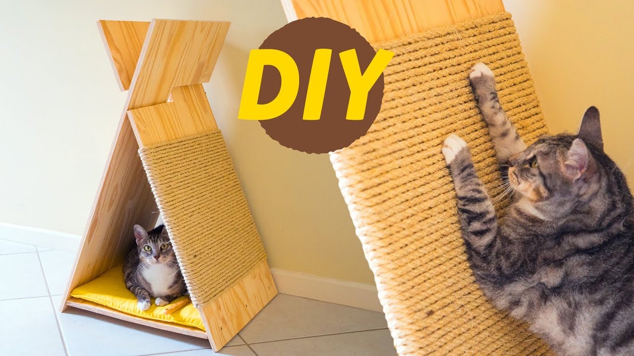 Essa é mais uma dica de como fazer arranhador para gatos que já tem uma caminha junto, mas esse é um modelo diferente, triangular. Seu gato vai dormir na parte de baixo e vai usar as laterais para afiar as unhas. Essa dica é feita com madeira e corda de sisal. Veja as dicas nesse tutorial do canal Diycore com Karla Amadori:
