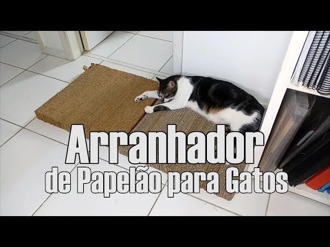 Existe também um modelo fácil de arranhador de piso, que fica como um tapete no chão e é feito só de papelão. Seu gato vai usar para arranhar e também para dormir em cima, pois para ele é confortável. Basicamente você vai cortar muitas tiras de papelão, todas do mesmo tamanho, e depois vai uni-las bem firme, fazendo um tapete. Aprenda o passo a passo e as dicas nesse vídeo do canal Coroa de Pano: