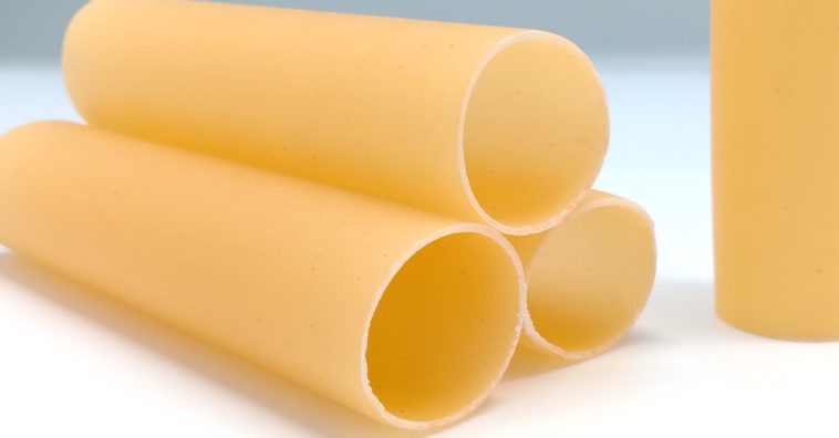 - A primeira etapa é colocar os tubinhos de massa em água quente para cozinhar por 3 minutos, temperados com sal. Escorra, deixe esfriar e corte-os ao meio;