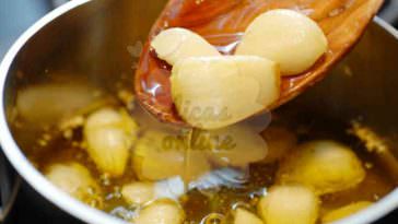 - Quando ferver, desligue e adicione o alho, cozinhando por 3 minutinhos;