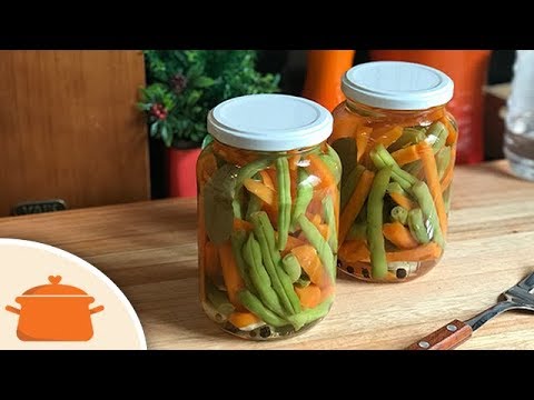 Essa conserva, sugerida pelo Panelaterapia, é feita com vagem e cenoura, ficando bem colorida e cheia de sabor. Para fazer o tempero, vai precisar de vinagre de álcool, água, açúcar e sal. Se quiser, pode colocar algumas bolinhas de pimenta preta para dar mais um toque de sabor. Veja no vídeo como fazer: