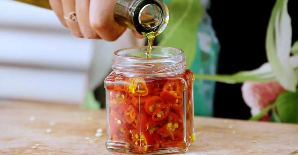 - Se quiser, depois de fechar e chacoalhar o vidro, abra de novo e coloque uma camada fina de azeite de oliva extravirgem para preservar melhor e dar um sabor extra. Nesse caso, não chacoalhe o vidro.