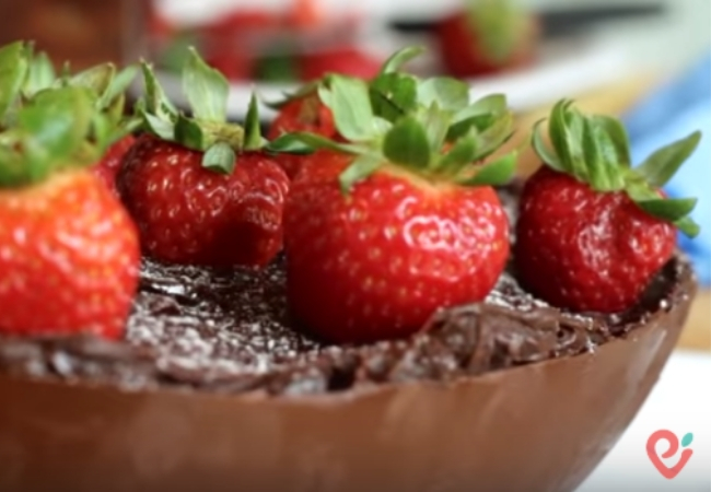 6. Para montar o ovo retire as formas da geladeira e recheie com o creme de morango. Devolva à geladeira por 30 minutos, ou até o recheio ficar consistente. Depois cubra com uma camada do restante chocolate derretido e reserve na geladeira por 1-2 horas.