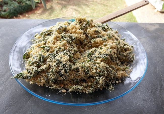 Essa é uma farofa para servir junto com a feijoada de domingo, todo mundo vai adorar. Para fazer vai precisar das folhas, alho, farinha de mandioca, sal, azeite e pimenta calabresa. Ela fica melhor se cortada bem fininha, pois assim vai deixar a farofa mais crocante.