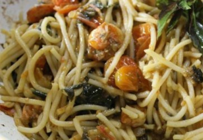 O macarrão é um prato muito simples, mas que pode ser transformado em gourmet com os ingredientes certos. Nesse caso é usado o macarrão tipo espaguete e o sabor fica por conta dos camarões e tomates confit. O prato também conta com os aromas e sabores do tomilho, alho, louro, manteiga, azeite, cebola, cheiro verde e manjericão.