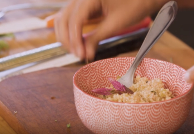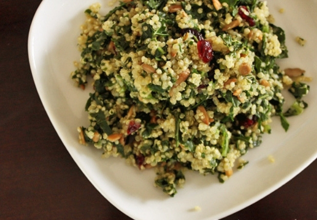 Voltando para as opções com menos carboidratos, essa salada morna é perfeita para acompanhar um peixe ou frango grelhado em um almoço leve, também no jantar. Os ingredientes que vai precisar são quinoa de qualquer tipo, caldo de legumes caseiro, sementes de girassol, tomilho fresco, cramberries ou passas, sal, pimenta e um vinagrete de gengibre especial.