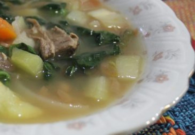 Essa é uma sopa bem tradicional e completa, com carne, feijão, macarrão e legumes picados em um caldo temperadinho. Por levar ingredientes de digestão mais lenta é melhor comer essa sopa no almoço. Os outros ingredientes são batata, tomate, feijão, chuchu, cenoura, cebola, macarrão, alho, sal e óleo.