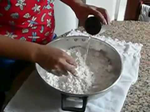 - Peneire uma porção de goma de mandioca hidratada em uma vasilha;