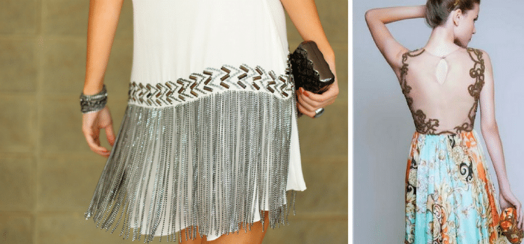 Detalhes em pedraria, mesmo que discretos, mudam completamente a peça, seja vestido, saia ou blusa. Se você tiver uma saia e uma blusa que usadas juntas dariam um belo vestido, faça uma faixa em pedraria para a cintura e já tem o seu vestido.