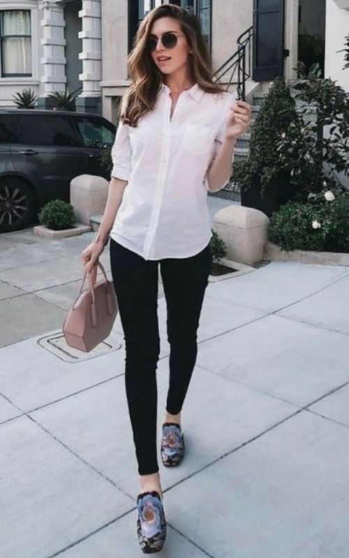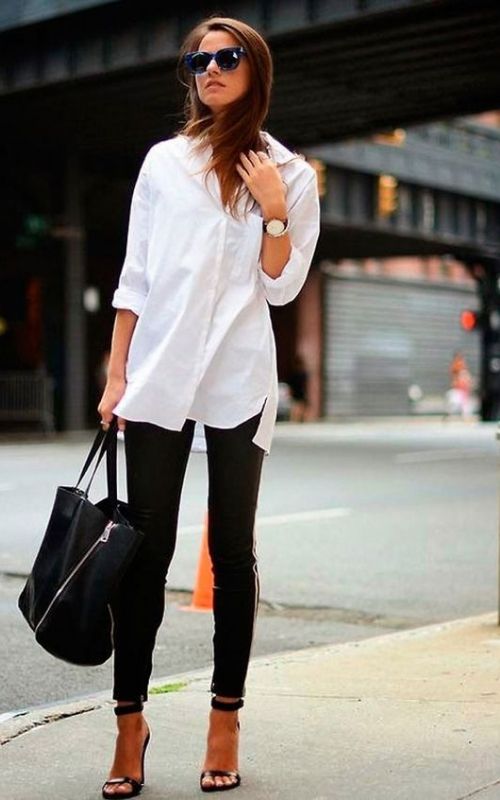 Assim como é fácil montar o look com legging e sapatilha, se você ama salto alto também pode combinar com muita facilidade. Um conjunto de calça preta e camisa branca tipo social mais larguinha é perfeito para um salto com ponta fina.