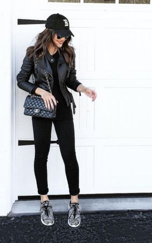 A jaqueta de couro é muito versátil, inclusive para compor um look mais despojado e esportivo com legging preta e tênis.
