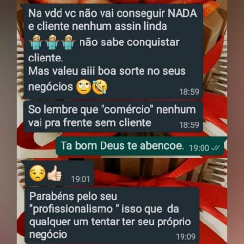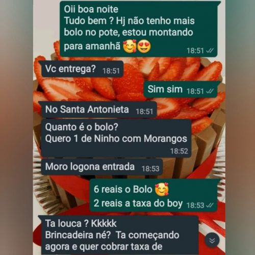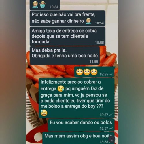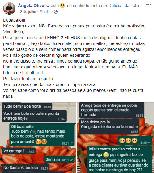 A pessoa que entrou em contato achou um absurdo que Ângela cobrasse a entrega do seu bolo, que é um produto barato. Mas, ela manteve uma postura educada e profissional durante toda a conversa, embora tivesse ficado muito abalada com as palavras agressivas que recebeu.