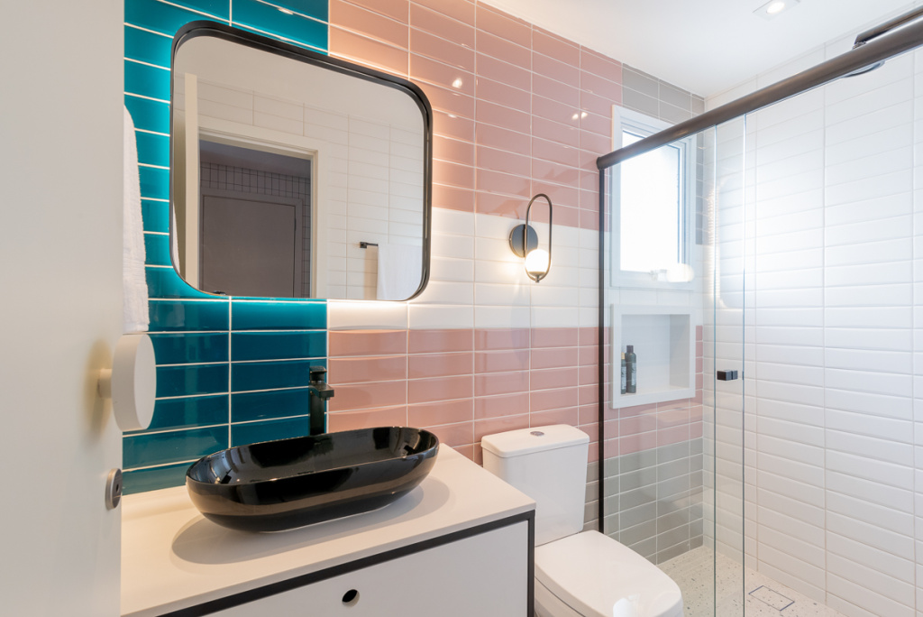 Em tons pastéis, com azulejos retangulares, espelho com cantos arredondados e efeito retroiluminado, esse banheiro ficou com um visual retrô lindo.