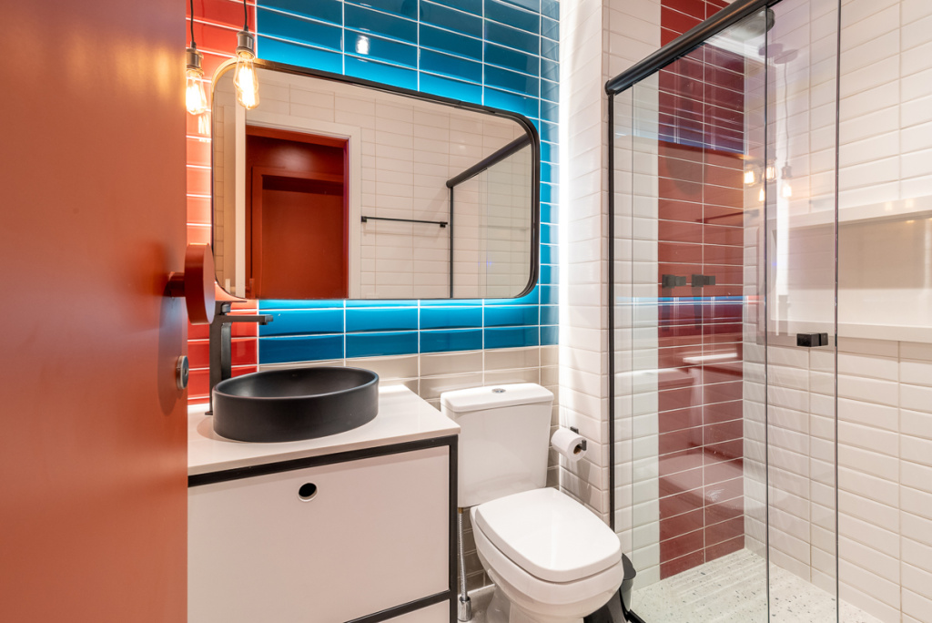 O outro banheiro do apê ganhou a mesma linguagem, mas com cores mais intensas e alguns diferenciais no design do espelho e da cuba.
