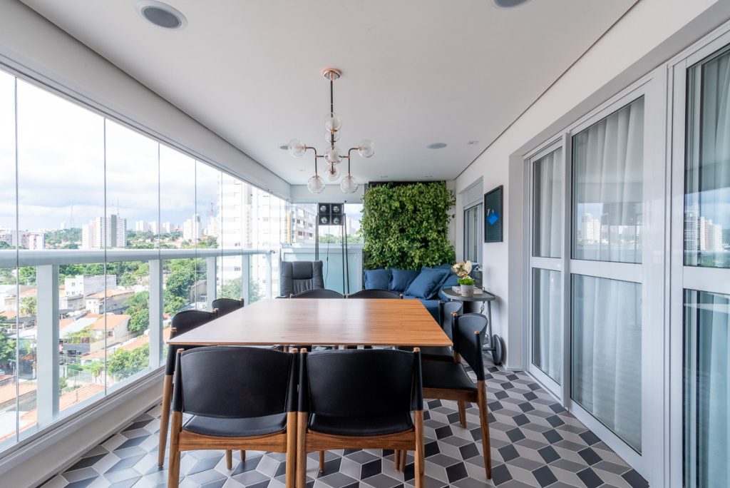 Na sacada fechada, que virou uma varanda gourmet, o piso recebeu um revestimento com efeito 3D, um jogo de mesa com oito cadeiras e um cantinho de estar com uma parede viva.