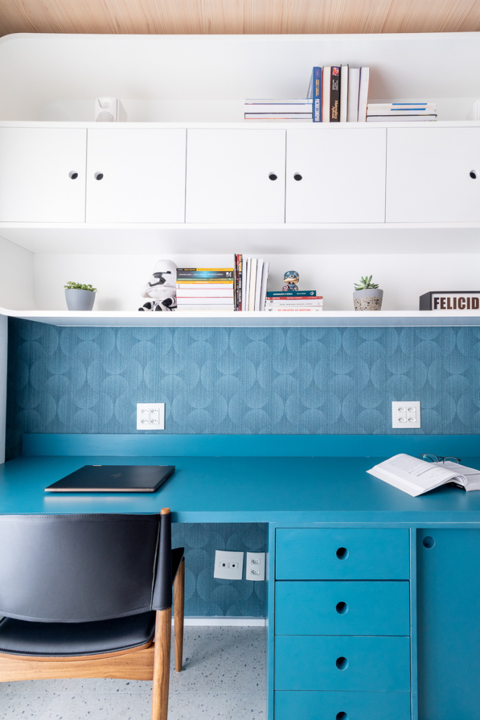 Para o home office, que precisa estimular a concentração e a criatividade, o contraste do branco com os dois tons de azul ficou sensacional.