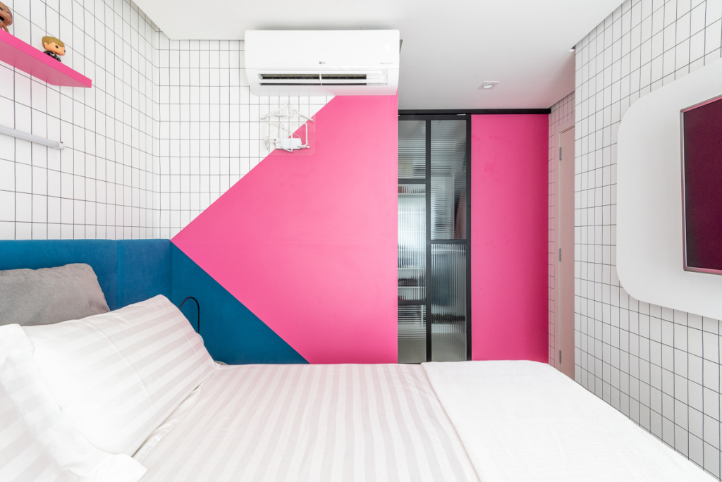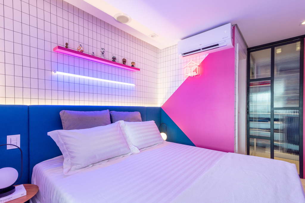 No quarto, a atmosfera futurista toma conta com uma mistura de revestimentos, iluminação com neon e led, e a intensidade do azul e do rosa, mas totalmente equilibrados pela base branca.