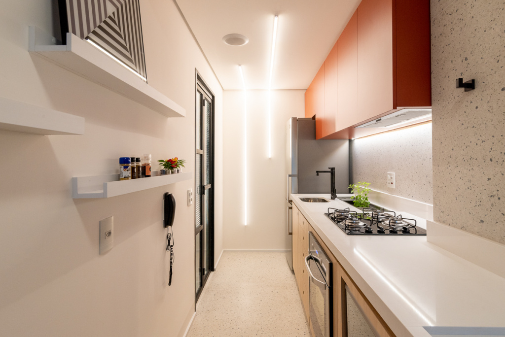 Por conta do formato comprido e estreito, a cozinha precisava ter cores mais claras e suaves para favorecer o momento de preparo das refeições. O ponto de cor ficou no armário aéreo, lindamente harmonizado com o revestimento tipo pedra.